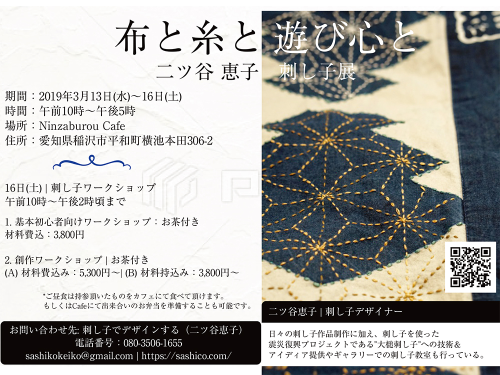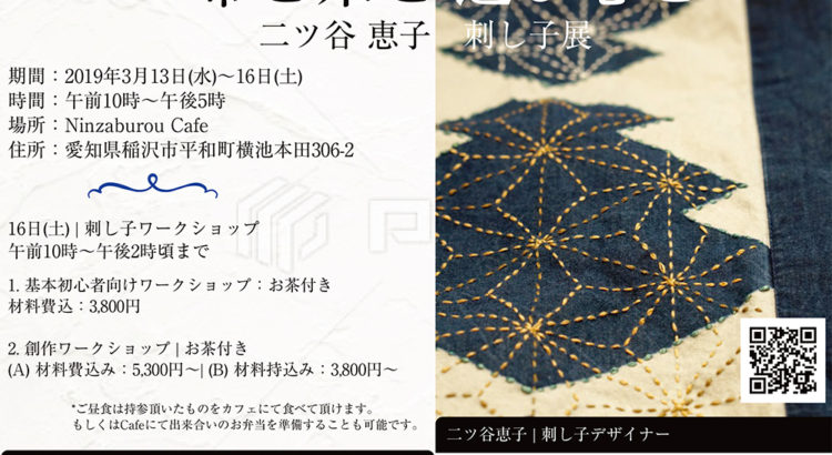 名古屋近郊の稲沢市にありますNinzaburou Cafe様にて、刺し子の展示会、及び刺し子のワークショップを開催させて頂くことになりました。
