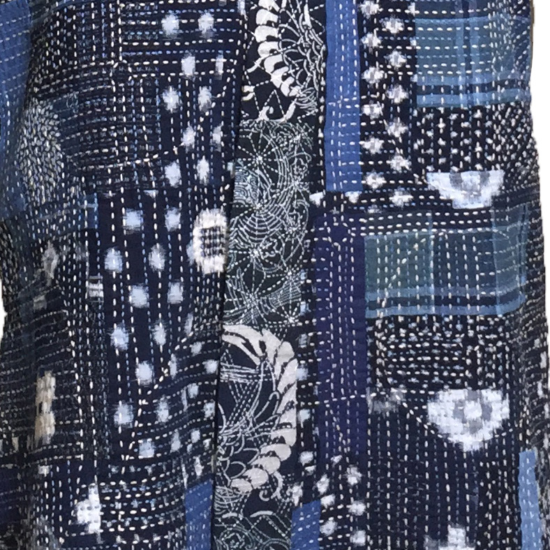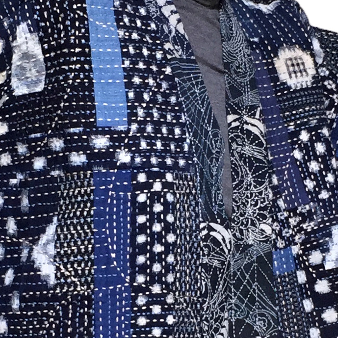 *ジャケットサイズの古布が手に入ることは珍しいことです。また、価値がある古布ほど、手のひらサイズの端切れだったりするのです。そんな貴重な、でも味があって素晴らしい色合いの古布を贅沢にパッチワークにし、そして補強と更なるデザインを加えるために刺し子をする。贅沢です。