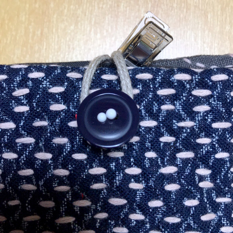 ファスナーでなくても、引っかかる感じのボタンとループでも十分だと思います。ファスナーに固執されるよりも、使ってほしいな……と思います。(刺し子の)くるみボタンを使ったり、木のボタンを使ったり、古布や草木染糸の残りを使ってループを作ったり……と、楽しんで頂ければ幸いです。紐もお好きなものをお使い下さい。布でも良いし革紐でも良いし。