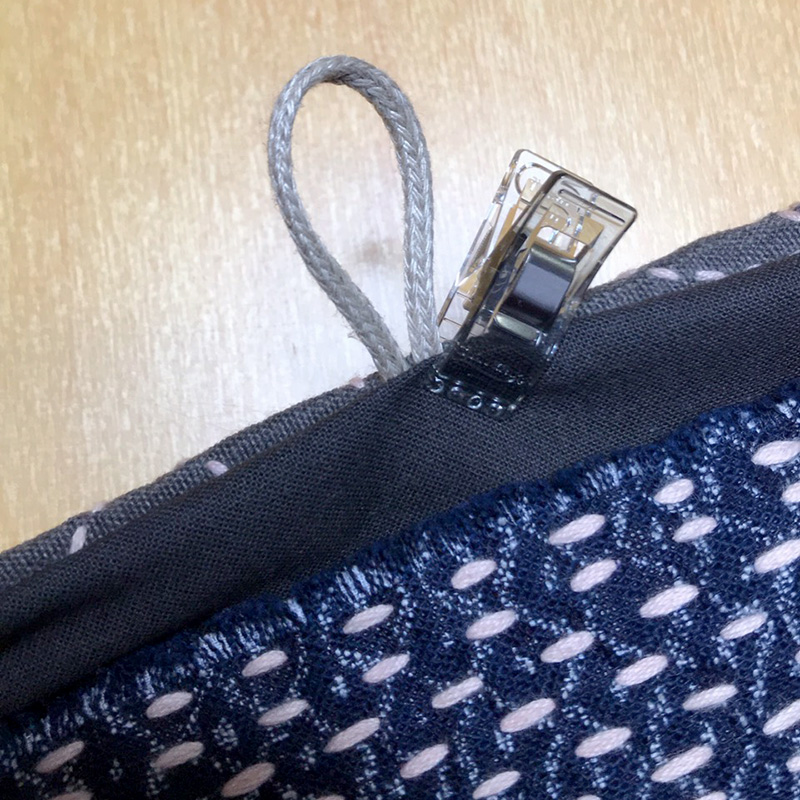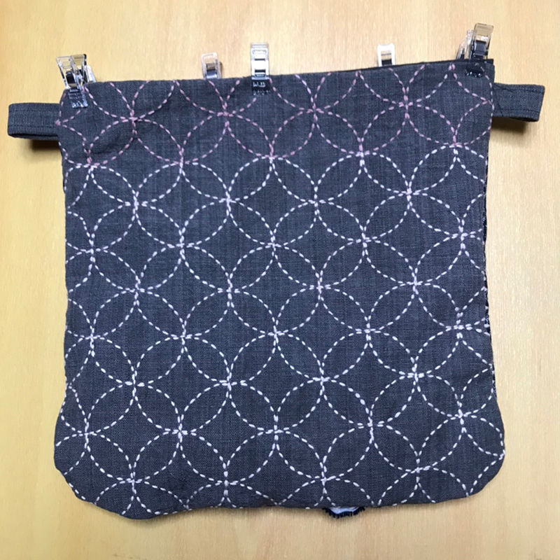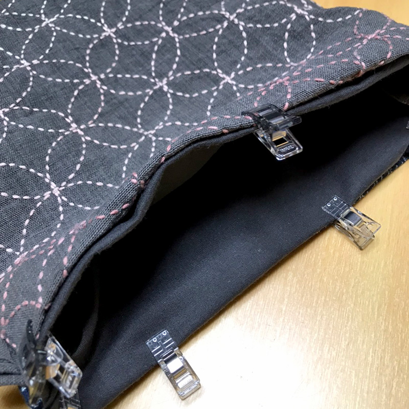 一目刺し布と刺し子布を中表にした状態で、写真のクリップで止めてある三辺をぐるりと縫います。