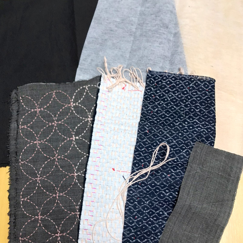 使用するのは、墨染の布、絣風のプリントがされた布、白い方眼の布、裏布(28cm x 62cmの大きさの布)、小さいハギレ、接着芯です。写真の墨染の布には七宝の刺し子がされていますが、これはサンプルの提供を下さったNaNaさんが既に刺し子をされているからです。