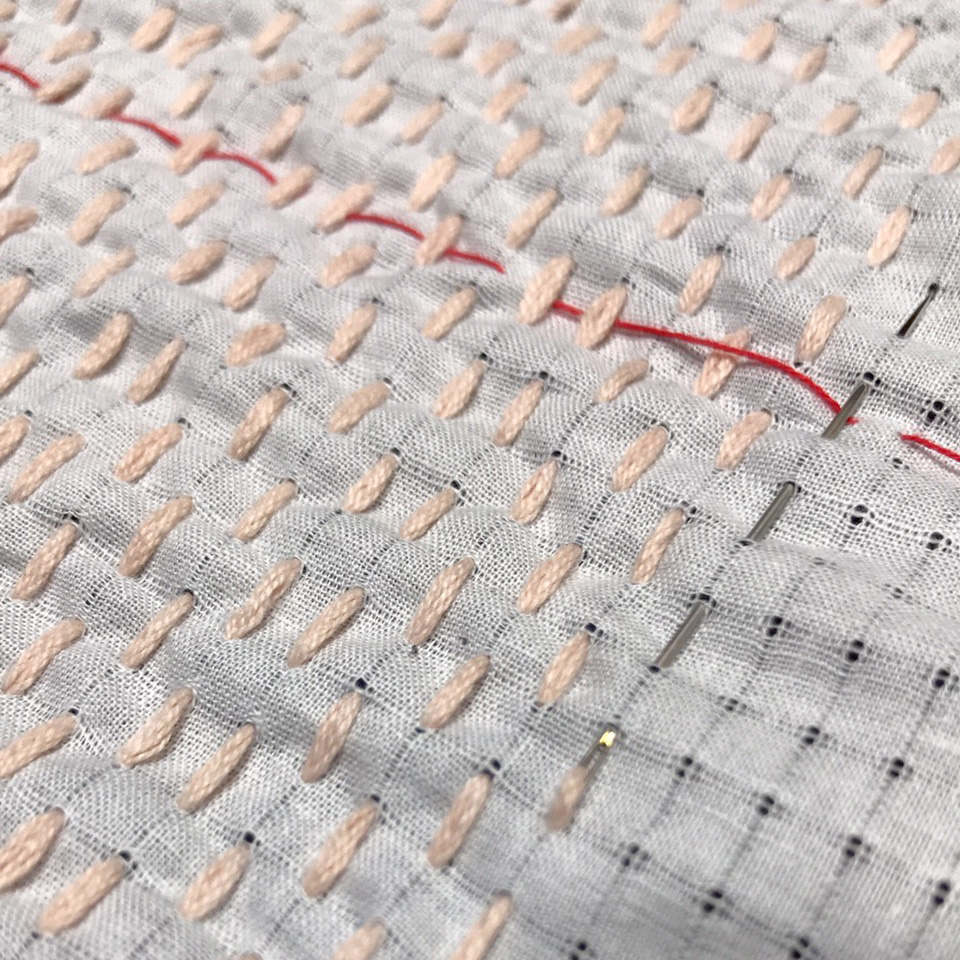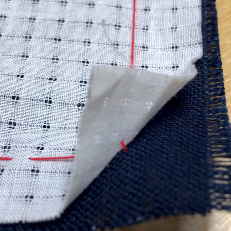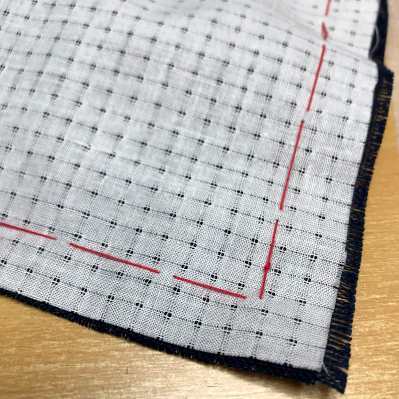 絣風の柄が印刷してある布の裏面に、白い方眼の布を重ねて下さい。しつけ縫いをするとズレにくくなるので、綺麗にさせます。しつけ縫いはひと手間ですが、おすすめです。(サンプルでは赤い糸にてしつけ縫いをされています)。