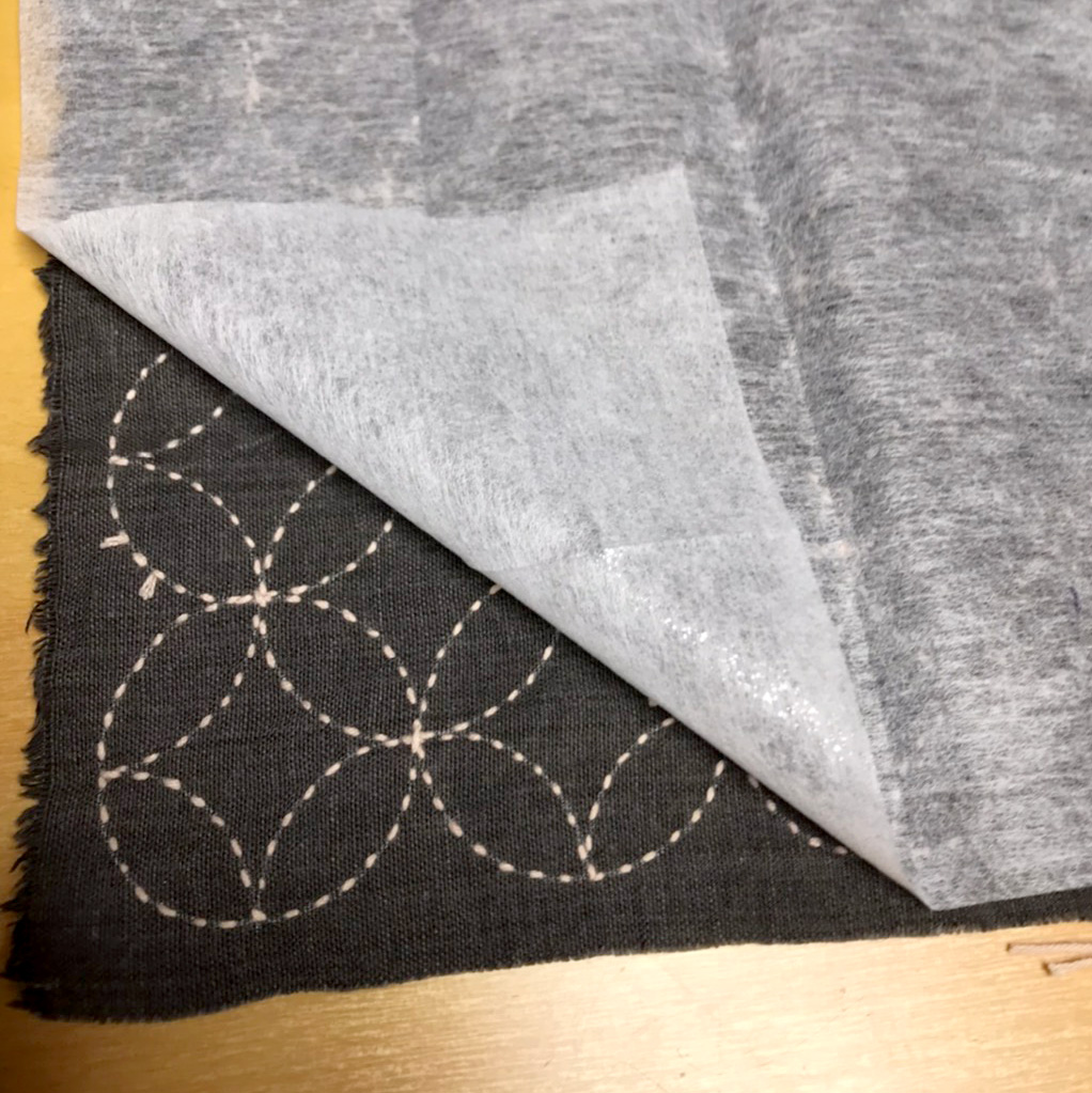 お好みの柄を刺し子して頂ければと思います。簡単に直接書ける麻の葉や七宝でもいいですし、同封されている恵子さんが準備しているマイラー用紙の柄を移されて刺し子を楽しまれても良いと思います。裏面には接着芯を貼ることになるので、裏面が綺麗である必要はありません。(サンプルは綺麗です)。