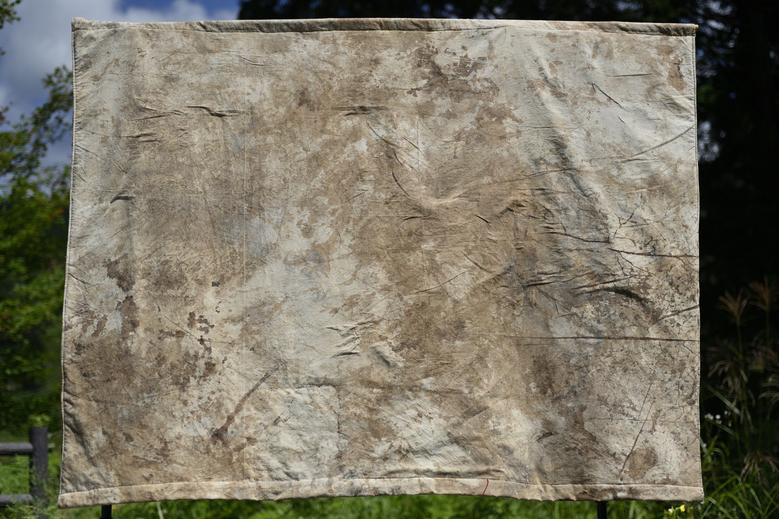 このブログの最初に「美術館に展示されることを最終目的に」とご紹介したので、少し矛盾に聞こえるかもしれませんが、このタペストリーにはできるだけ陽の光を浴びて欲しいと思っています。流れが血液の流れであり、それ以外の藍染や絣の古布との刺し子は肉体であり、このタペストリーが一つの「生き物」として存在していって欲しいという願いがあります。藍染めは使えば使うほど色が変化し、まるで生きているように感じられることができるのですが、タペストリーという性質上(使う用途としては展示することが一番多い)、太陽の光で時と共に、私等と一緒に、時を刻んで欲しいという願いで柿渋を選びました。